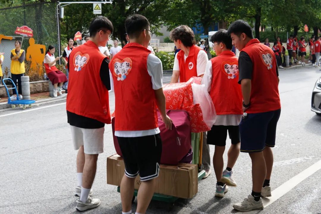 热情的学长学姐们早就等候在路旁,接过萌新们手中的行李,带领大家前往宿舍区。